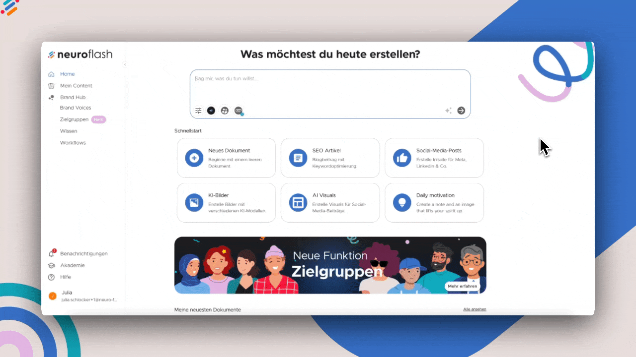 Überlege dir Use Cases, die im Alltag, im Job und im Umgang mit neuroflash auf dich zukommen werden. Wende hier bei der Texterstellung beispielhaft die Brand Voice an und schaue dir deine Texte an.