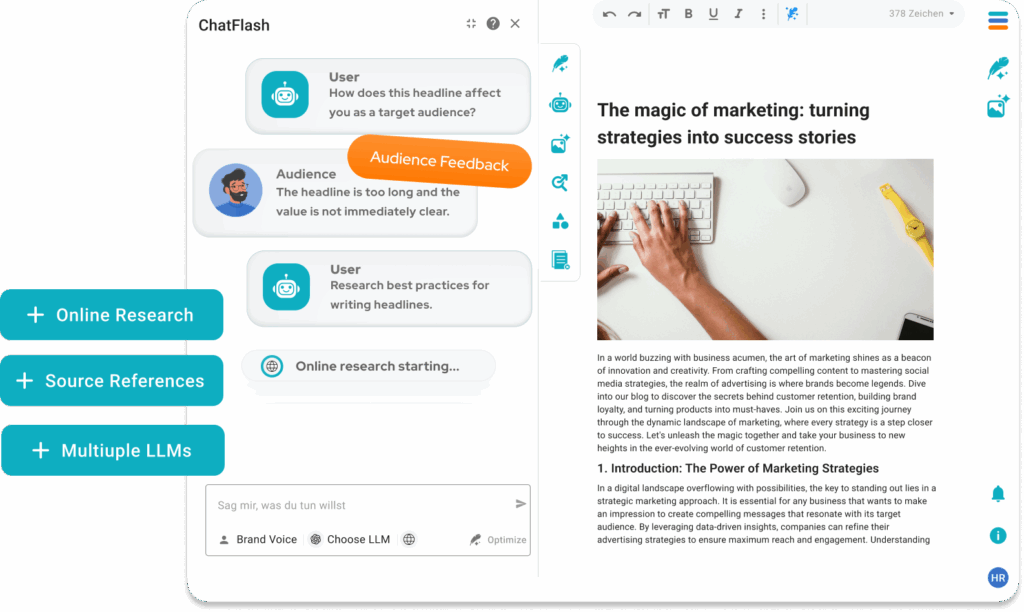 Inflection AI is een bedrijf dat software ontwikkelt met behulp van kunstmatige intelligentie en machinaal leren om de communicatie tussen mens en machine te vergemakkelijken. Hun aanpak lijkt echter weinig origineel in een reeds verzadigde markt van soortgelijke bedrijven die dezelfde diensten aanbieden. Als het gaat om het vinden van alternatieven voor Inflection AI, zijn er een paar belangrijke opties die je moet overwegen, want het is ChatFlash van neuroflash. Dus waar wacht je nog op? Klik hier en gebruik ChatFlash vandaag nog helemaal gratis!